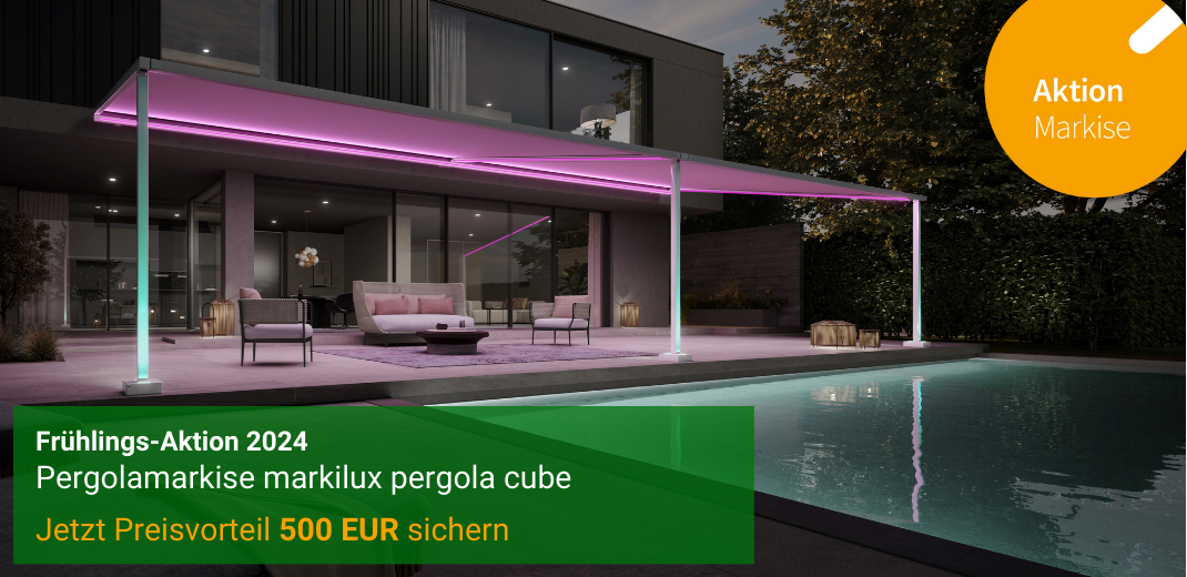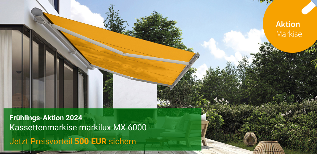 Gönnen Sie sich den Schatten, den Sie schon immer wollten mit einer Designmarkise von markilux und sparen Sie dabei. Vom 20. März bis 30. Juni 2024 erhalten Sie von uns einen Aktionsrabatt in Höhe von 500€ auf ausgewählte Terrassenmarkisen und Pergolamarkisen.