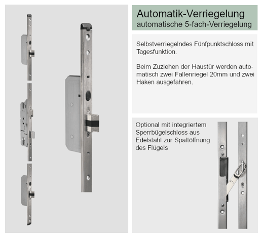 Die Frage, wie Sie künftig Ihre Tür nutzen wollen, bestimmt die Wahl der richtigen Verriegelung. Neben den Standard-Schlössern, die über die Schlüssel bedient werden, gibt es mittlerweile eine Reihe von automatisierten oder motorisierten Schloss-Varianten, die jede für sich einen ganz bestimmten Bereich abdeckt.