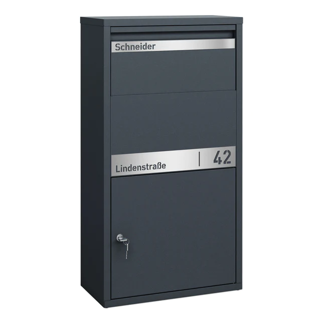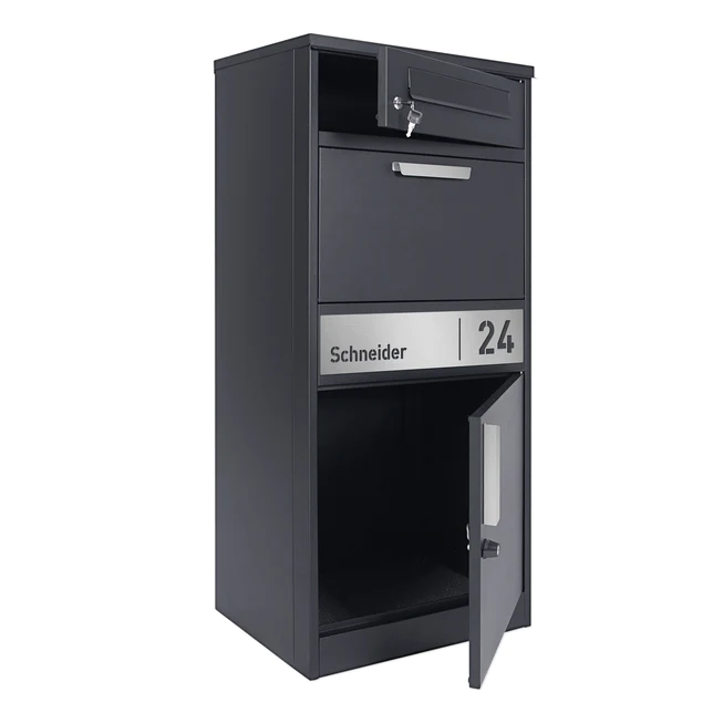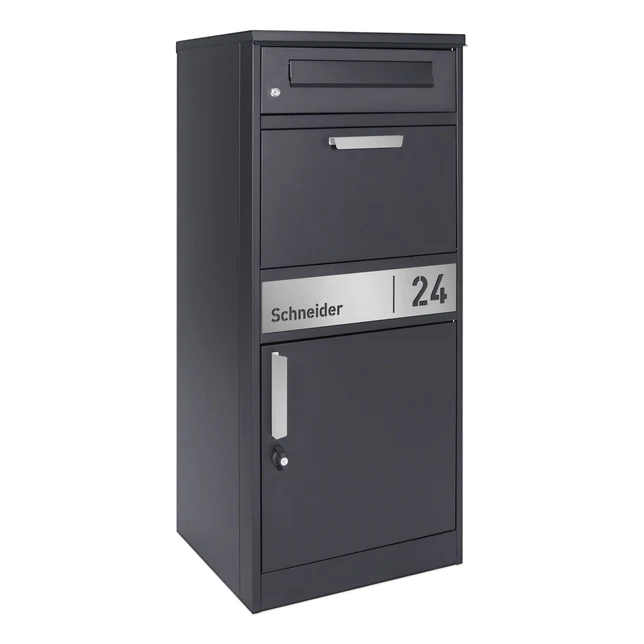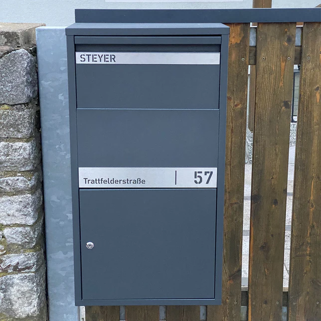 Die freistehende Paketbox PB1 bietet Platz für Briefe und Pakete bis zu einer Größe von 400x400x150 mm. Mit ihrer personalisierbaren V2A-Edelstahlleiste verleiht sie Ihrem Zuhause einen individuellen Touch. So haben Sie eine Paketbox für alle Paketdienste und einen Paketbriefkasten in einem.