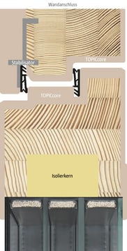 Dieses von TOPIC selbst entwickelte Oberflächensystem wird überall dort eingesetzt, wo Oberflächen deckend lackiert werden. TOPICcore ist die vollständige Ummantelung des Holzkerns der Türe – und höchst witterungsbeständig. Basis ist ein duroplastischer Werkstoff. Dieser schmilzt nicht, ist unlöslich, hart und nicht temperaturabhängig. Durch diese UV-beständige und zu 100 Prozent wasserfeste Schutzschicht wird ein witterungsbedingtes Nachstreichen unnötig. TOPICcore wird mit einem auch im Flugzeubau eingesetzen seidenmatten Speziallack lackiert.